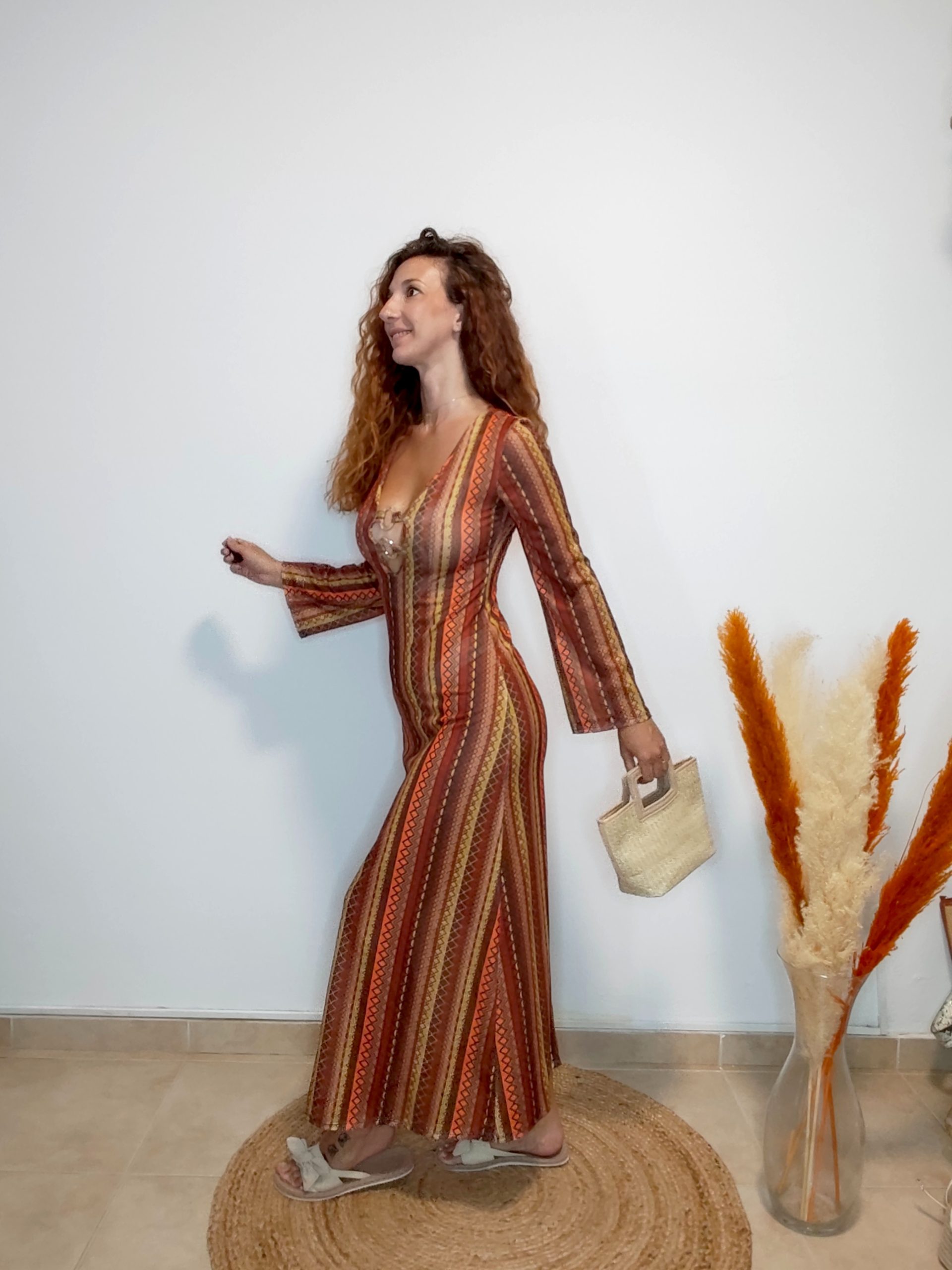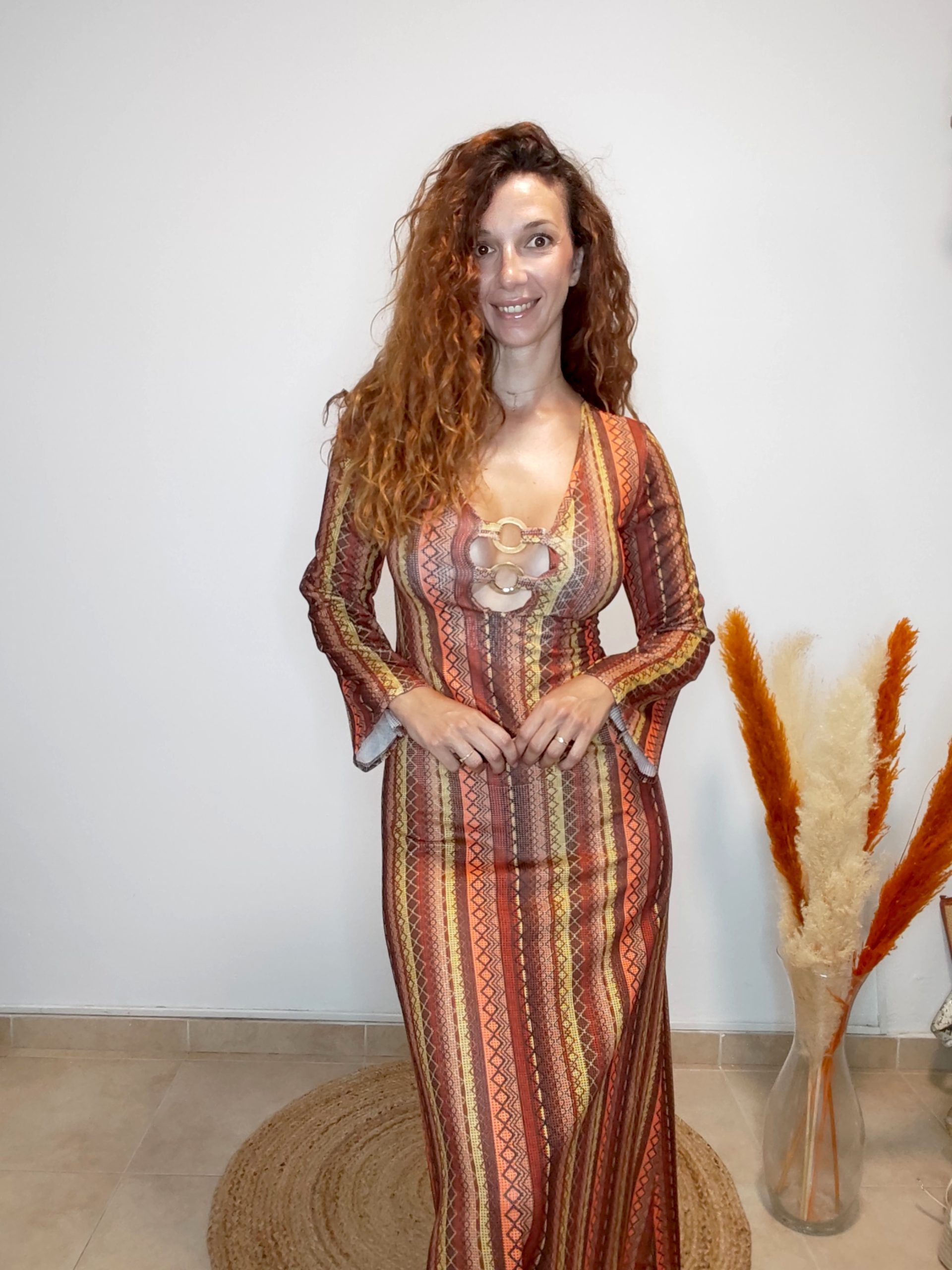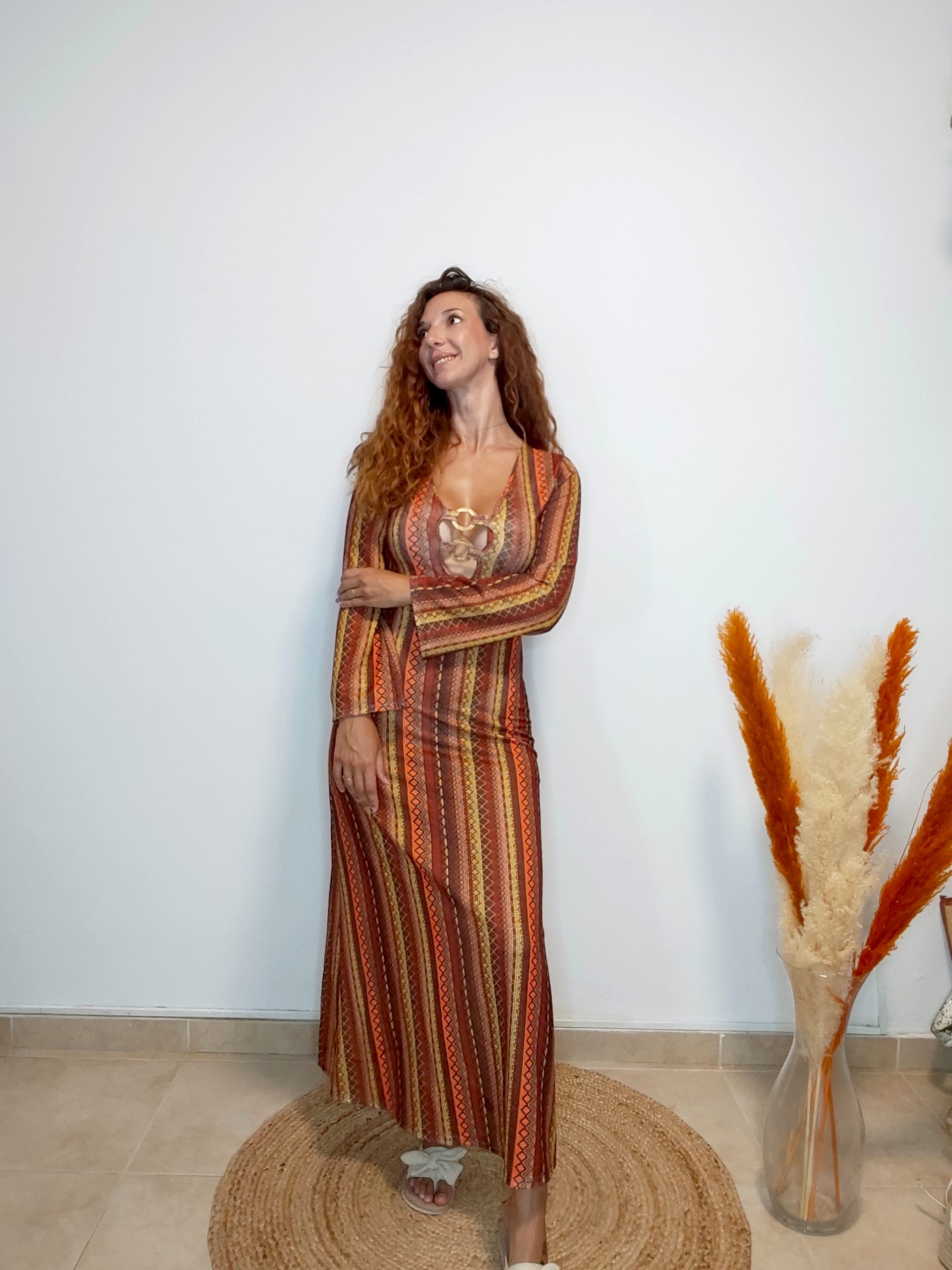 El Vestido Retro Chic destaca por su estampado en zigzag que remite a la vibrante moda de los años 70, con una paleta psicodélica que combina colores llamativos y alegres. Una prenda perfecta para quienes aman la moda vintage con un toque moderno.